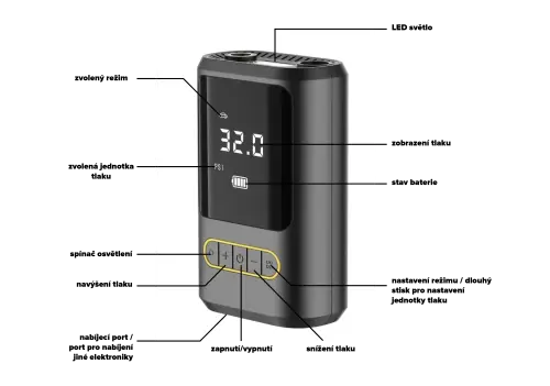 Okrem detekcie tlaku v pneumatikách a vzduchového kompresora ponúka tento praktický pomocník aj ďalšie praktické funkcie. Zariadenie má LED svetlo s niekoľkými možnosťami osvetlenia. Biele svetlo možno použiť buď ako baterku/lampu, alebo aj ako predné svetlo na bicykel v krajnej núdzi. Režim červeného výstražného svetla možno zase použiť ako výstražné svetlo zadného bicykla. Zariadenie sa dá použiť aj ako powerbanka, takže si môžete na cestách nabíjať napríklad mobilný telefón alebo inú drobnú elektroniku.