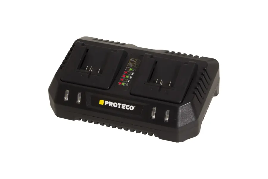 Nabíjací zdroj je určený pre dva Akumulátory Li-ION 20V 2000 mAh a 4000 mAh PROTECO. Po pripojení akumulátor vykoná kontrolu a riadené dobitie na max. možnou kapacitu. Aktuálny stav nabíjacieho zdroja zobrazujú 2 farebné diódy.