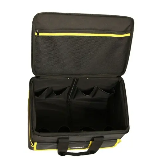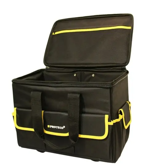 Taška pracovné na kolieskach Proteco s objemom 42 litrov je vhodná pre všetky kutilov. Vďaka 2 kolieskam, teleskopickému madlu a bočným pogumovaným rukovätiam sa dá s brašnou ľahšie manipulovať. Dno tašky je zosilnené. Rôzne veľkosti vreciek aj pružných popruhov umožňujú univerzálne uloženie rôzneho náradia. Celá brašna je prispôsobená aj pre prácu v rukaviciach. Taška obsahuje vnútorné a vonkajšie vrecká, zatváranie veka oceľovým zipsom. Dĺžka teleskopického madla zloženého je 35 cm, rozloženého 91 cm.
