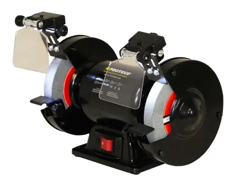 Brúska dvojkotúčová Proteco sa hodí do každej dielne. S 2 dodanými kotúčmi v rôznej zrnitosti zvládne jemnejšie i u hrubšie brúsenie. S vhodným 150 mm kotúčom možno leštiť i ostriť. Pevná konštrukcia na liatinovom podstavci. Priehľadná ochranná clona, čiže lapač iskier pre ochranu Vášho zraku pri brúsení s integrovaným led osvetlením napájaného batériami.