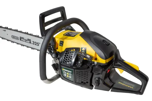 Benzínová reťazová píla Proteco je ideálnym pomocníkom na rezanie dreva s malým a stredným priemerom, vetvenia, prerezávanie, rezanie palivového dreva atď. Úspešná kombinácia vysokorýchlostného dvojtaktného motora s výtlakom 50,8 cm ³ a výkonom 2,1 kW robí z motorovej píly veľmi populárne pohodlie a kompaktného pomocníka pre každého vášnivého pomocníka alebo záhradníka. Reťazová píla má 72 cm koľajnicu a oregonský reťazec na plnenie aj najnáročnejších úloh. Motor je chránený nielen proti nárazu montážou tichýchblokov a plastových krytov, ale aj, pokiaľ je to možné, bez vibrácií a hluku. Optimálne napätie pílovej reťaze je možné ľahko nastaviť pomocou skrutky na bočnej strane reťazovej píly.