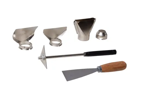 Súčasťou balenia: Prepravný kufor, nástavec na ochranu skla, nástavec na zváranie rúr, kužeľový nástavec, nástavec na sušenie a rozmrazovanie, škrabka na farby a laky, špachtľa
