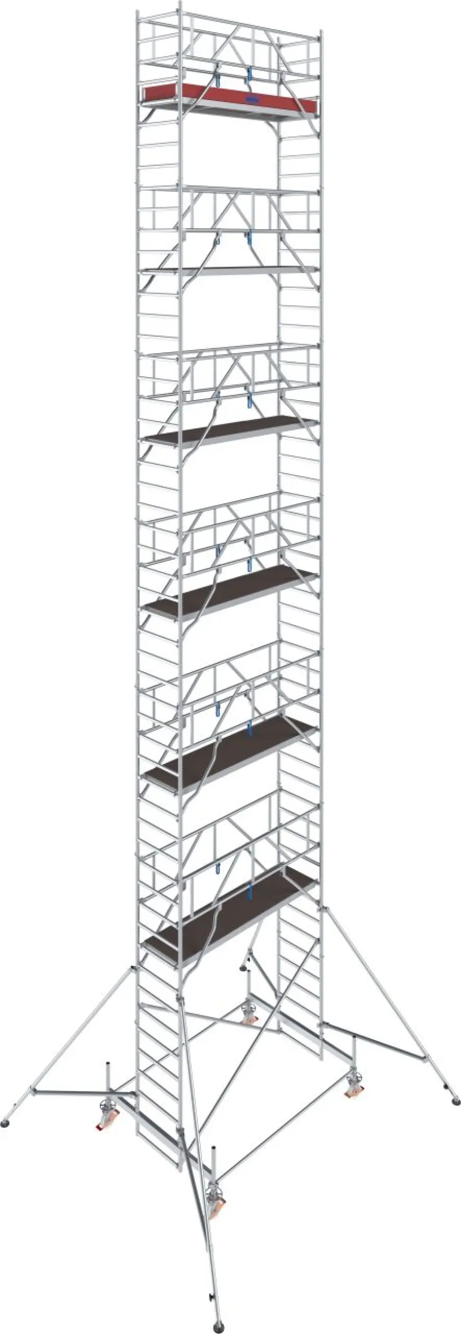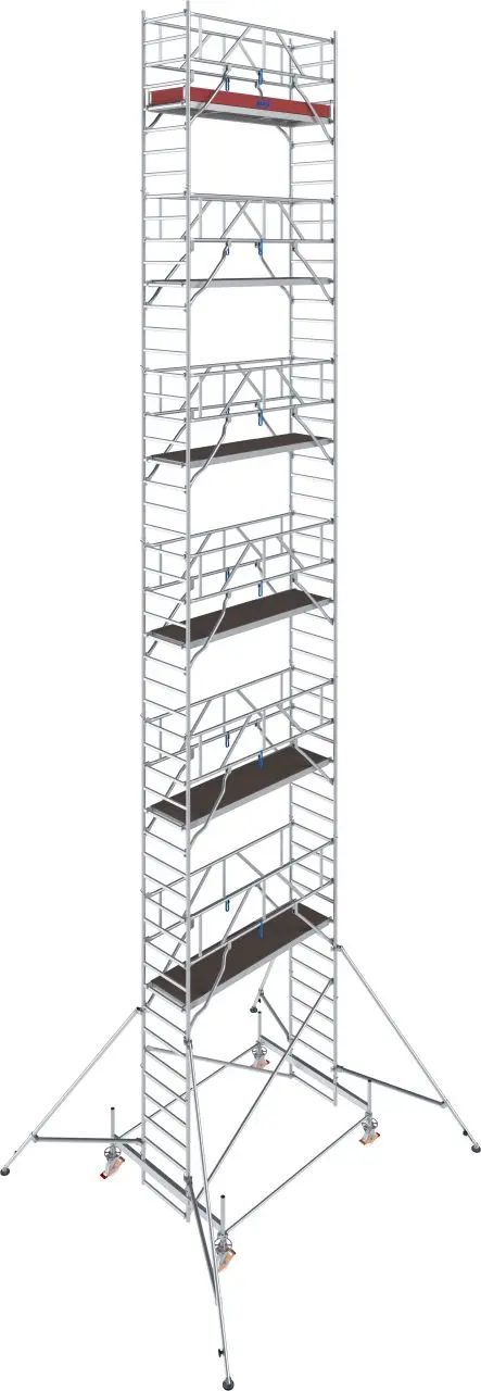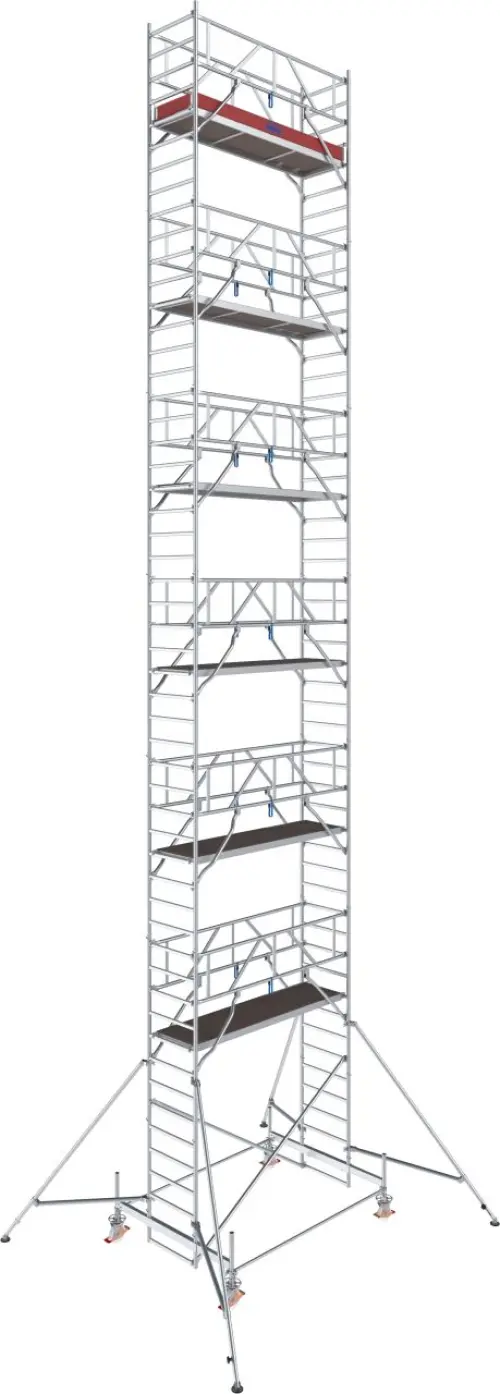 Výškovo nastaviteľné kolieska Ø 200 mm so skrutkovým mechanizmom umožňujú vyrovnanie aj na nerovnom podklade. Pre vyššie konfigurácie (od cca 7,50 m) sa používajú teleskopické výložníky pre bezpečnú stabilizáciu.