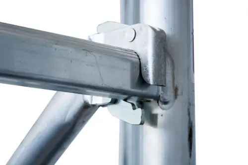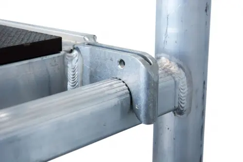 Zábradlie a rám sa upevňujú ešte pred montážou ďalšej plošiny, čím je zaistená ochrana proti pádu už pri výstupe.