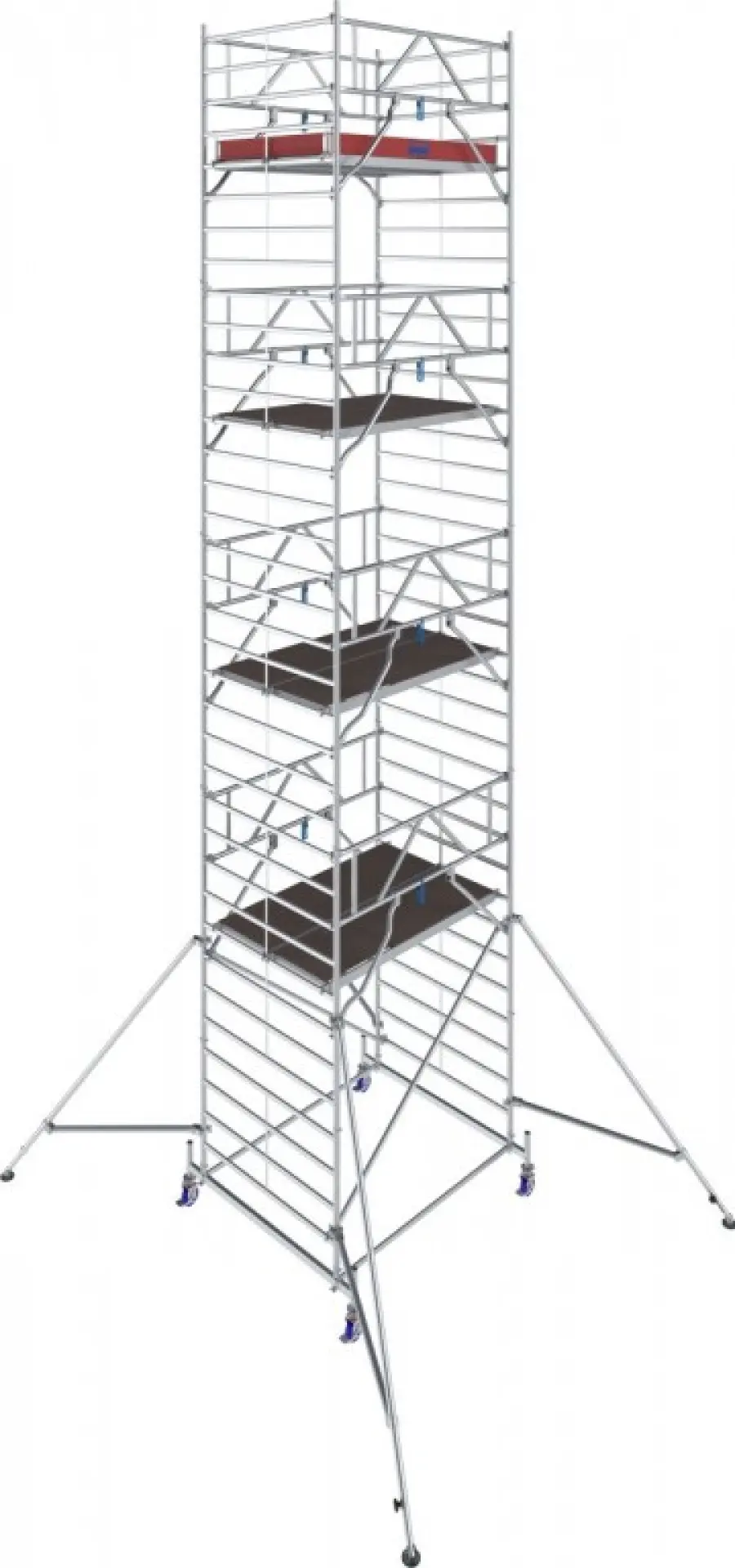 Od výšky 4,40 m sú súčasťou oceľové stabilizátory, od 6,40 m potom aj teleskopické výložníky s nastaviteľnými pätkami pre vyššiu stabilitu. Kolieska s nastaviteľnou výškou (Ø 150 mm) uľahčujú presun aj prácu na nerovnom teréne.