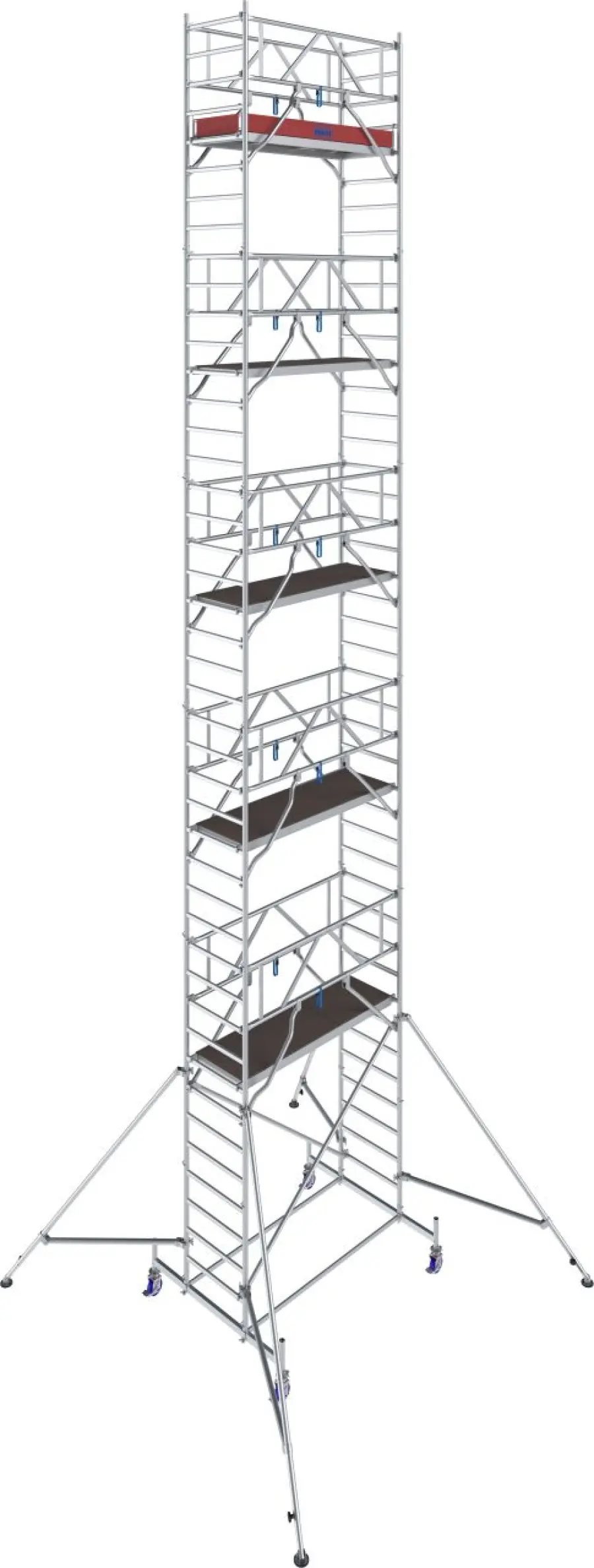 Od výšky 4,40 m sú súčasťou oceľové stabilizátory, od 7,40 m potom aj teleskopické výložníky s nastaviteľnými pätkami pre vyššiu stabilitu. Kolieska s nastaviteľnou výškou (Ø 150 mm) uľahčujú presun aj prácu na nerovnom teréne.