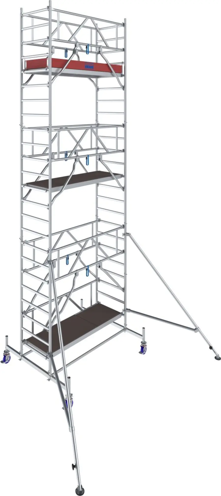 Od výšky 4,40 m sú súčasťou oceľové stabilizátory, od 7,40 m potom aj teleskopické výložníky s nastaviteľnými pätkami pre vyššiu stabilitu. Kolieska s nastaviteľnou výškou (Ø 150 mm) uľahčujú presun aj prácu na nerovnom teréne.