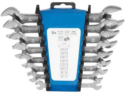 Sada vidlicových kľúčov DIN 3110 8-dielna na plastovom držiaku predstavuje veľmi rozsiahlu sadu kľúčov postavených z najpoužívanejších rozmerov. Vidlicové kľúče sú vyrobené z vysoko kvalitnej chróm-vanádovej ocele a pri vysoko kvalitnom spracovaní sú vhodné najmä na uvoľňovanie a uťahovanie skrutiek, matiek a šesťhranných skrutiek.