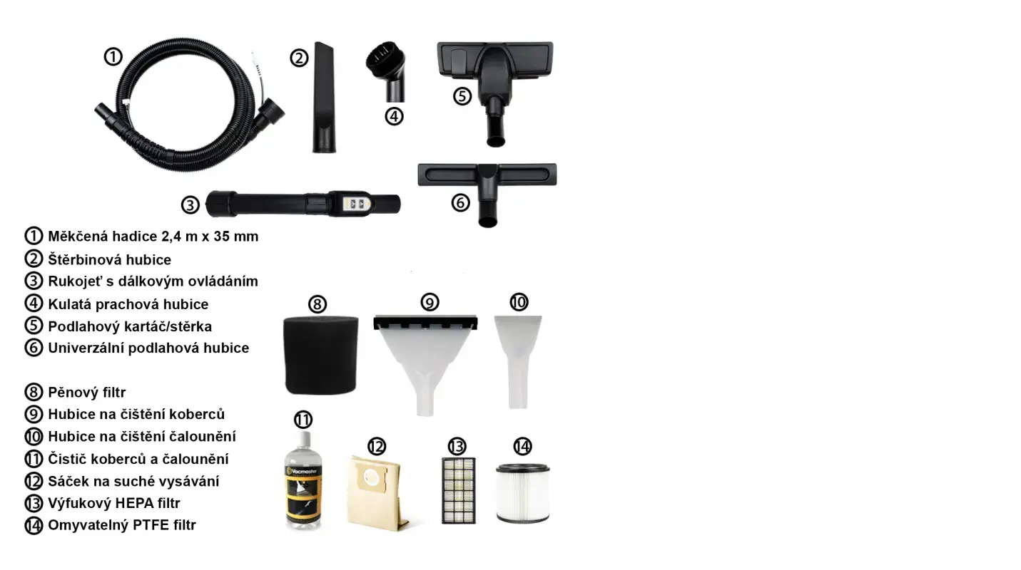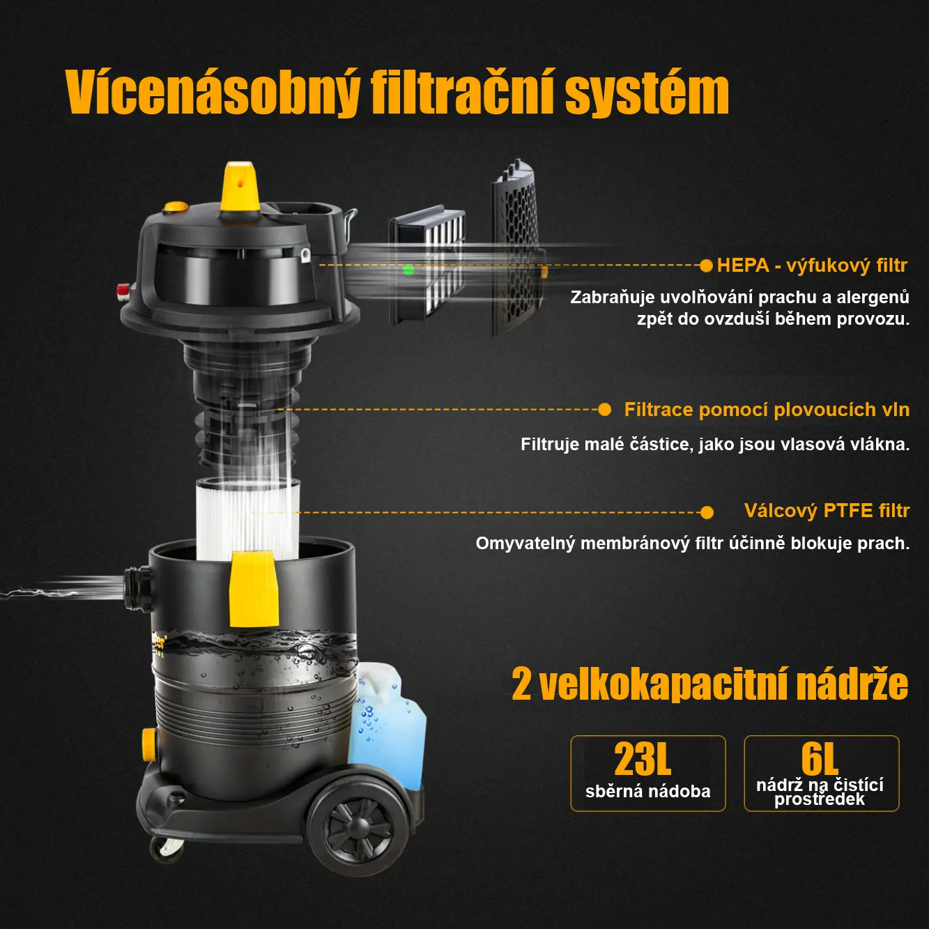 príkon 1300 W; objem nádoby 23 l; nádoba na čistiaci prostriedok 6 l; dĺžka kábla 10 m; hmotnosť 10,8 kg