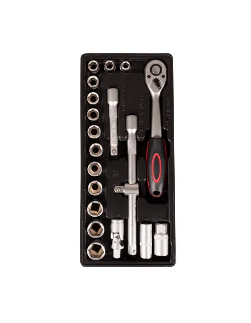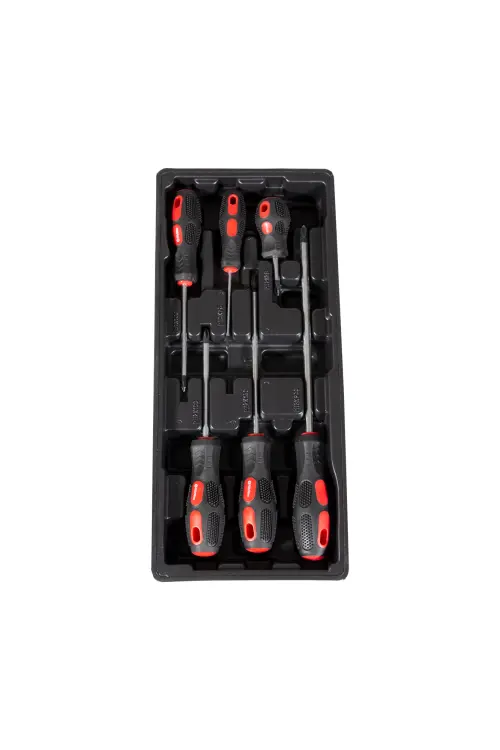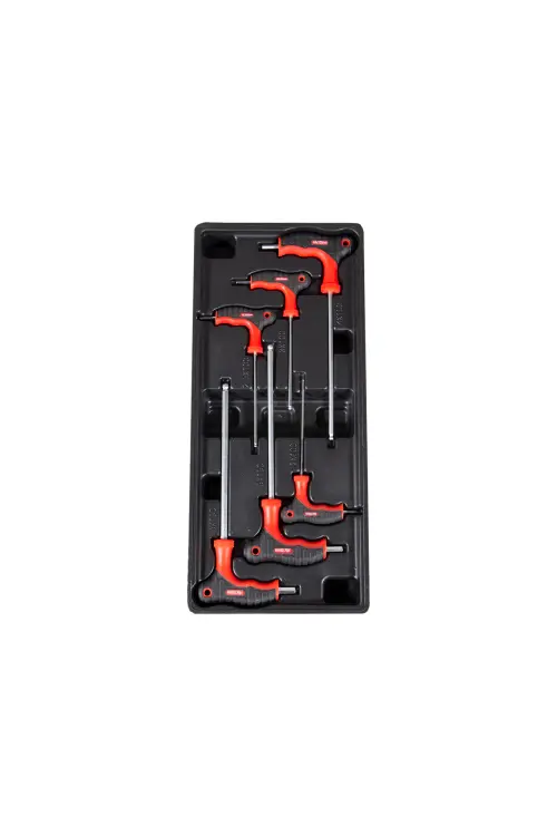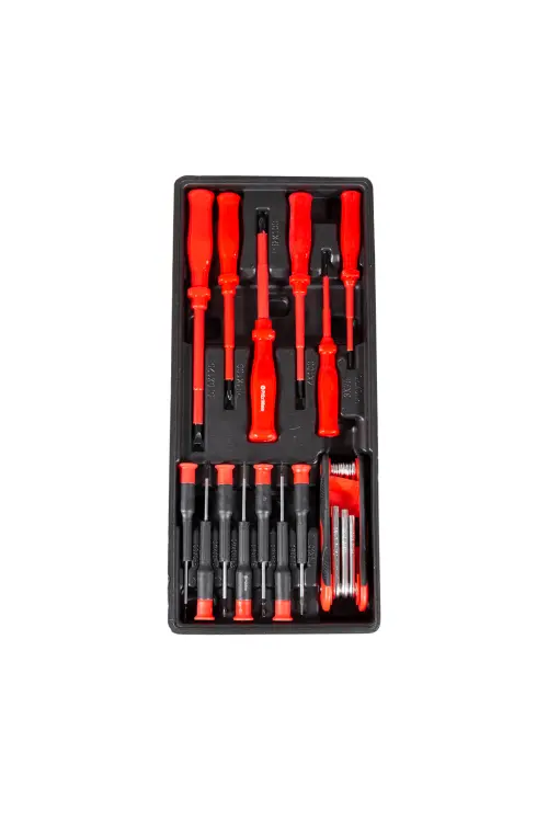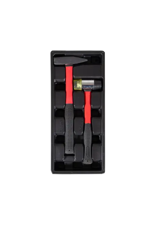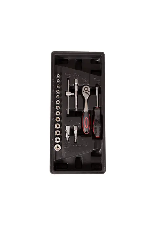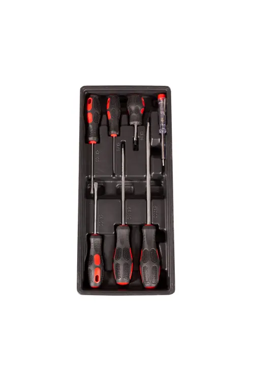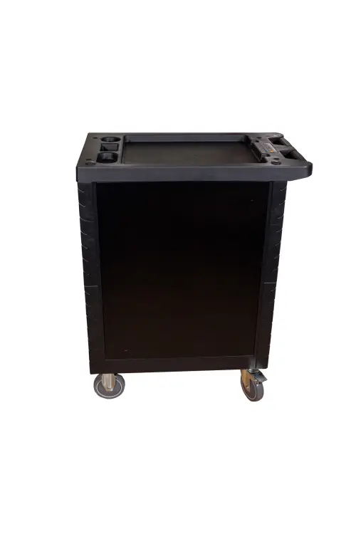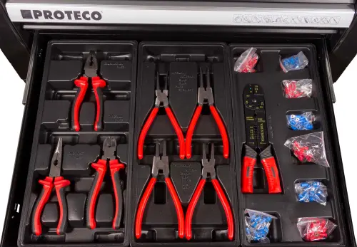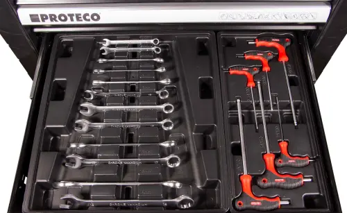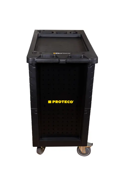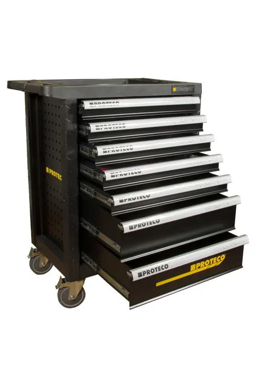 Pojazdná dielenská skriňa na náradie s pojazdovými kolesami slúži na ukladanie drobného náradia alebo nástrojov. Je osadená siedmimi zásuvkami. Všetky zásuvky sa vysúvajú na oceľových lištách opatrených guličkovými ložiskami. Každá zásuvka je aretovaná proti samovoľnému vysunutiu. Zásuvku je možné otvoriť iba ťahom za čelnú rukoväť, kedy stlačením lišty v rukoväti döjde k odisteniu zásuvky. Na zamedzenie prístupu nepovolaným osobám k náradiu slúži zámok na bočnej strane vozíka. Je možné ním centrálne uzamknúť všetkých 7 zásuviek naraz. Horná doska s rozmermi 683x460 mm je z tvrdeného plastu a je možné ju využiť ako pracovný stolík na drobné montážne práce. Na odloženie drobných dielov slúžia 3 prelisy v pracovnej doske. Súčasťou dosky sú aj dve rukoväte na manipuláciu so skriňkou. Na uľahčenie transportu je skriňa osadená štyrmi kolesami s gumovými obručami. Gumové obruče znižujú vibrácie aj hlučnosť pri transporte. Dve kolesá sú pevné a dve otočné s aretovanými brzdami. Zošliapnutím bŕzd je možné zaistiť skriňu proti pohybu. Bočnice skrine sú opatrené univerzálným perforovaním, na ktoré je možné osadiť háčiky alebo držiaky a navýšiť tak úložnú kapacitu. Hrany skrine sú chránené proti poškodeniu plastovými rohovými nárazníkmy.