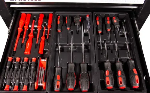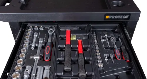 pojazdný; s 253 ks náradia "Všetko pre domácich majstrov"; robustná konštrukcia (kov/tvrdá liatina); 7 uzamykateľných zásuviek; ochrana proti samovoľnému otváraniu; horná doska ako menšia prac. stôl
